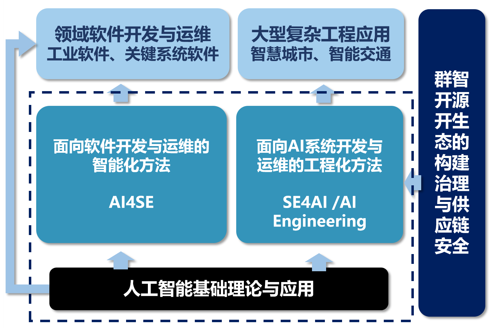 围绕大型复杂软件群体化、生态化特征及开源软件开发模式在开发效率与质量保障方面的挑战,继续引领群体智能和群体软件工程方向研究,在软件工程、人工智能及交叉领域取得具有国际影响力的原创成果。重点研究群体智能基础理论、群智化开发方法与环境、群体智能系统构造与测试方法、群智汇聚的开源软件生态及供应链安全等,研制群体化软件开发、测试工具与平台,支撑群体软件开发环境与生态构建;围绕经济社会发展的重大需求,服务自主可控开源社区建设,推动国家软件产业发展。